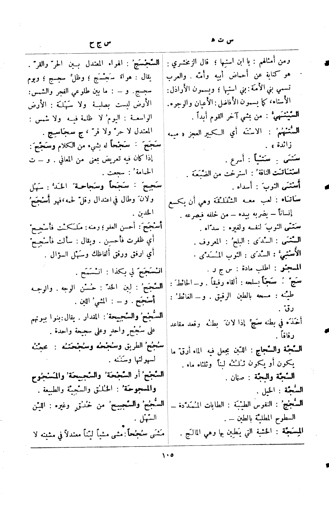 السجسج: الهواء المعتدل بين الحر والقر. يقال: هواء سجسج؛ وظل سجسج< ويوم سجسج. و-: ما بين طلوعي الفجر والشمس: الأرض ليست بصلبة ولا سهلة: الأرض الواسعة: اليوم لا ظلمة فيه ولا شمس: المعتدل لا حر ولا قر, ج سجاسج. سجح- سجحًا له بشيء من الكلام وسجح: إذا كان فيه تعريض بمعنى من المعاني. و- ت الحمامة: سجعت.