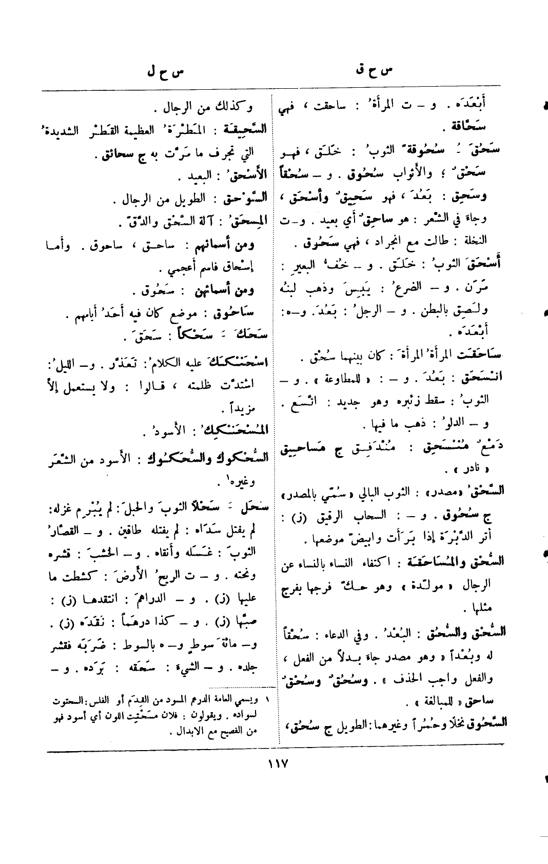 السحق "مصدر": الثوب البالي "سمي بالمصدر"ج سحوق. و-: السحاب الرقيق (ز): أتر الدبرة إذا برأت وابيض موضعها.