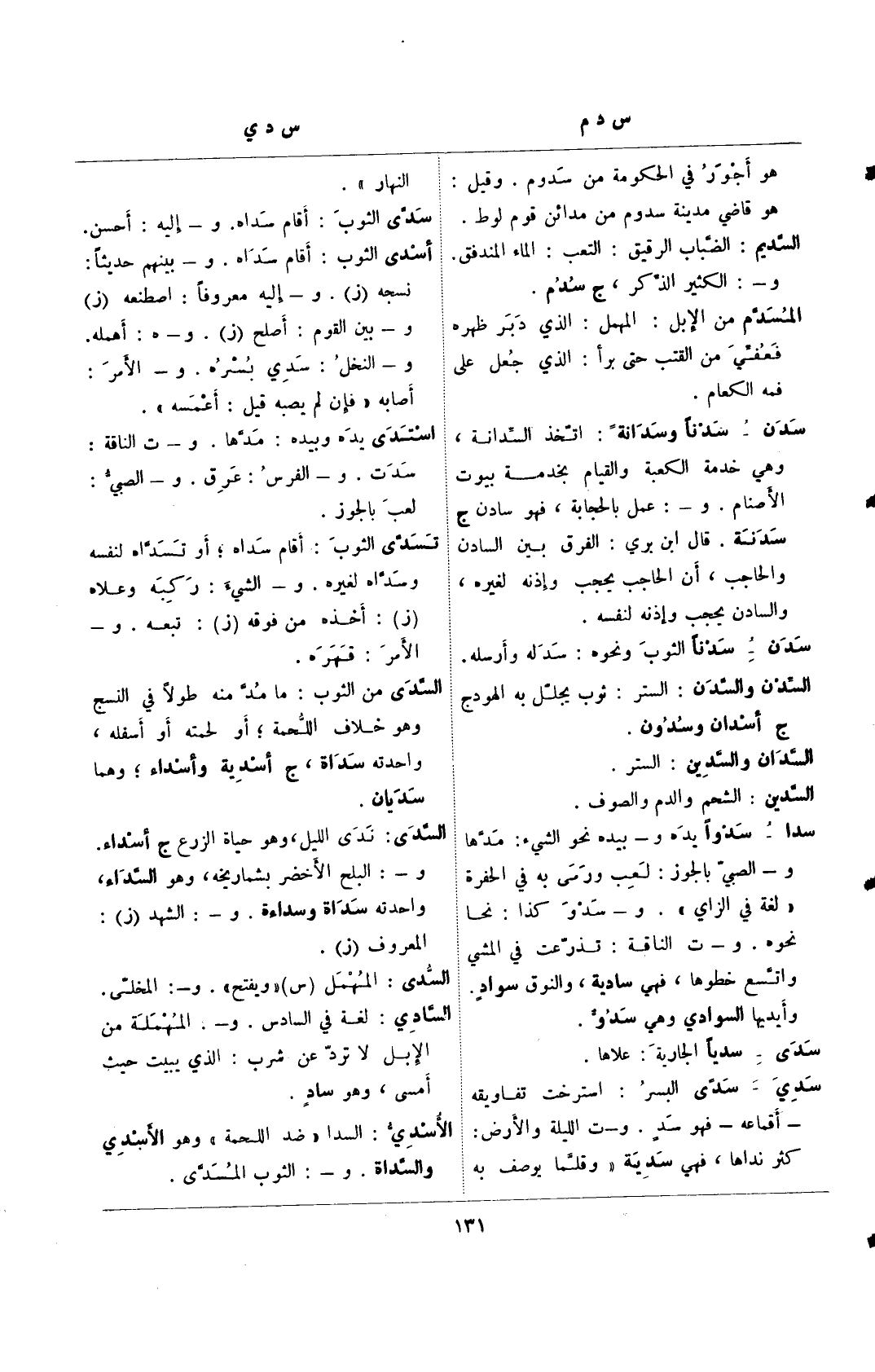 سدا_ سدوًا يده و_ بيده نحو الشيء: مدها و_ الصبي بالجوزك لعب ورمى به في الحفرة "لغة في الزاي". و_ سدو كذا: نحا نحوه. و_ ت الناقةك تذرعت في المشي واتسع خطوها، فهي سادية، والنوق سواد. وأيديها السوادي وهي سدو.