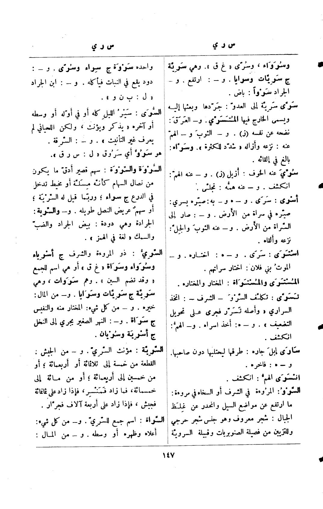 وسرواء، وسرًى "غ ق". وهي سرية ج سريات وسرايا. و_: ارتفع. و_ الجراد سروًا: باض.