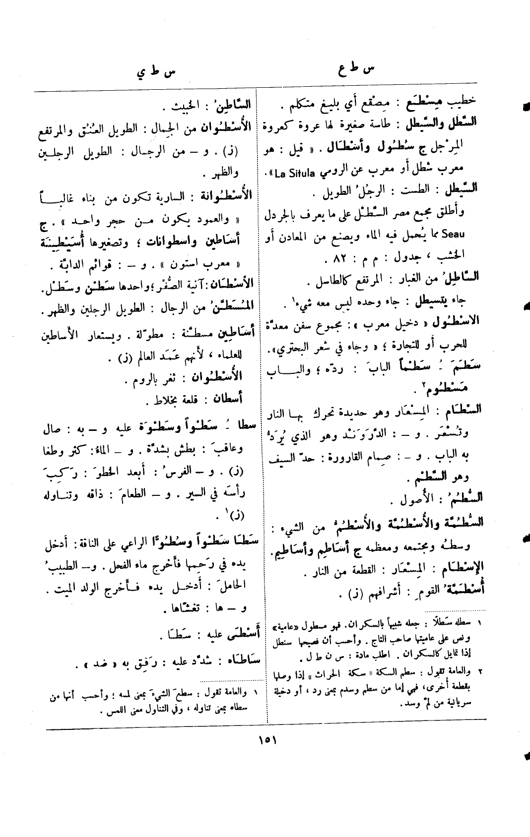 سطا: سطوا وسطوه عليه و- به: صال وعاقب: بطش بشدة، و – الماء: كثر وطغا (ز) و- الفرس: أبعد الخطو: ركب رأسه في السير، و– الطعام: ذاقه وتناوله (ز) (¬3)