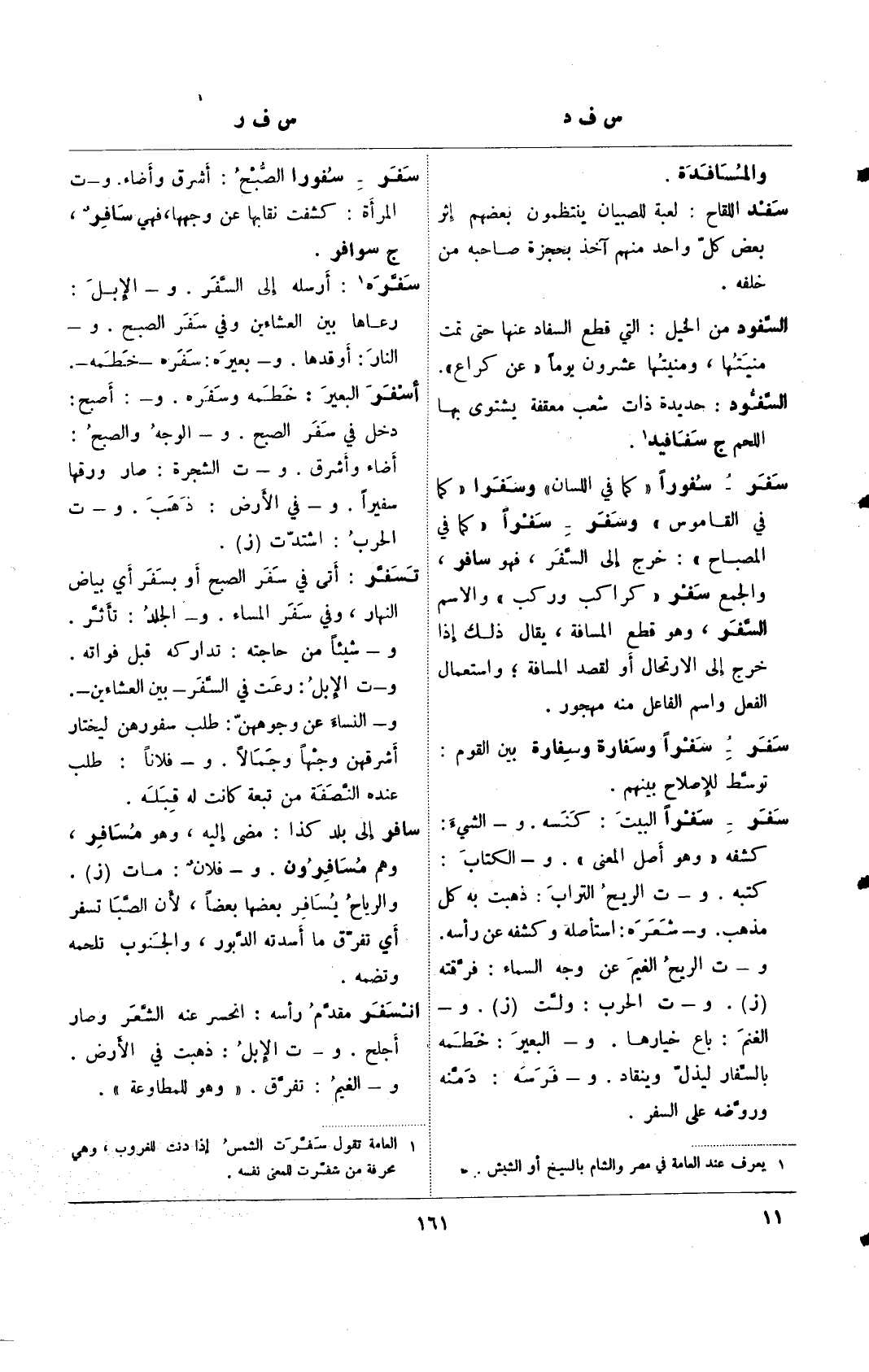سفر_ سفورا الصبح: أشرق وأضاء. و_ ت المرأة: كشفت نقابها عن وجهها، فهي سافر، ج سوافر.