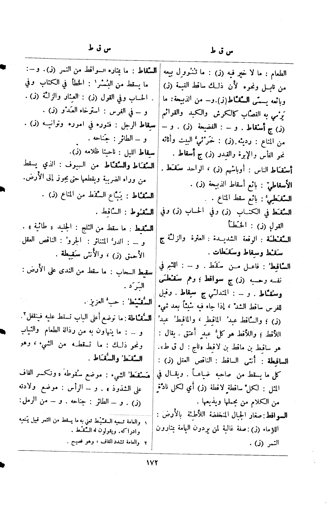 السقاط: ما يمتاره السواقط من التمر (ز) و-: ما يسقط من البسر (¬1): الخطأ في الكتاب وفي الحساب وفي القول (ز): العثار والزلة (ز) و– في الفرس: استرخاء العدو (ز)