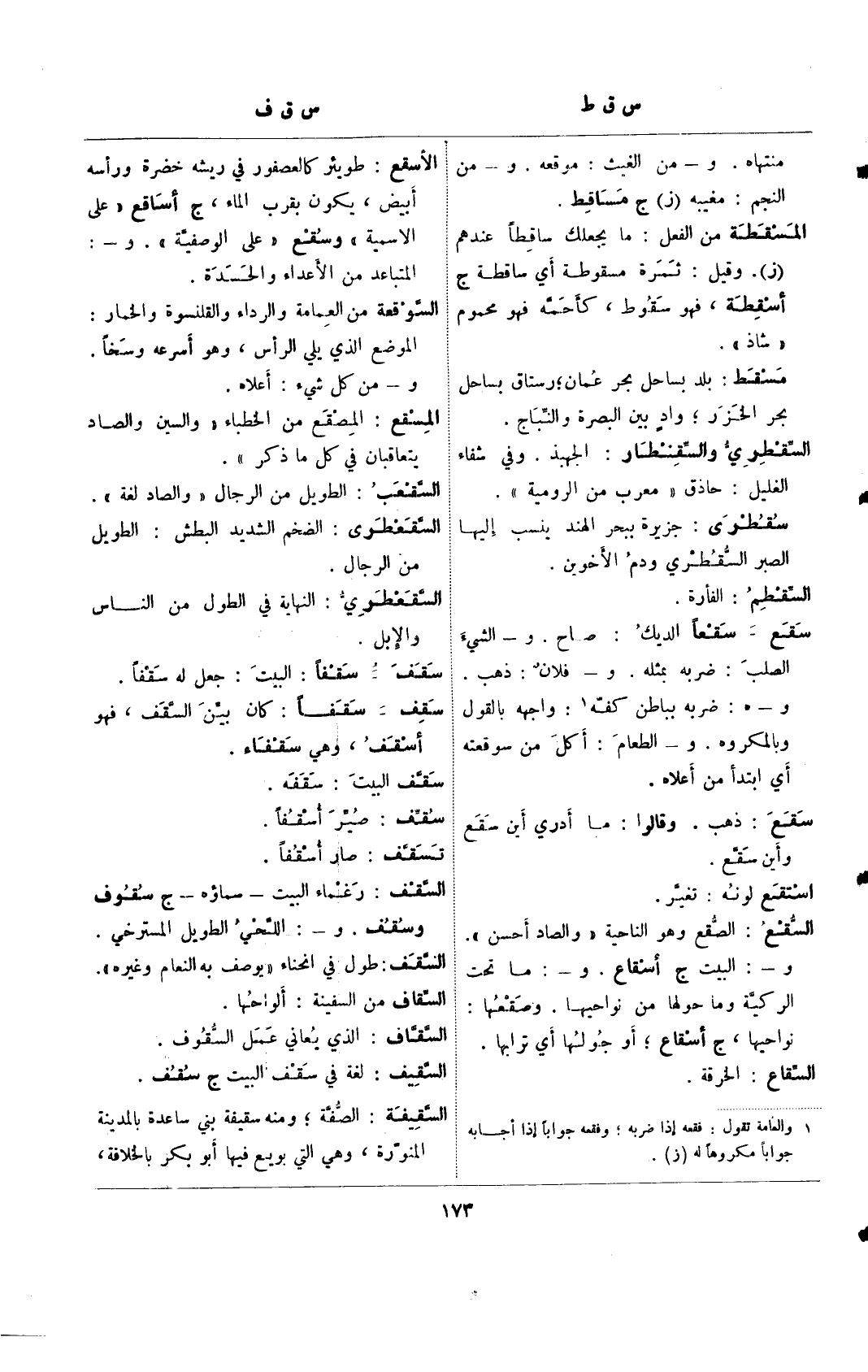 سقع– سقعا الديك: صاح و– الشيء الصلب: ضربه بمثله، و– فلان: ذهب. و– هـ: ضربه بباطن كفه (¬1): واجهه بالقول وبالمكروه و– الطعام: أكل من شوقعته أي ابتدأ من أعلاه.