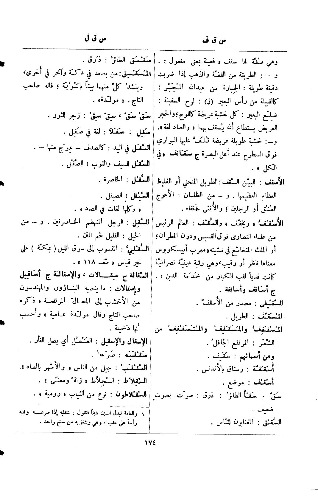 وهي صفة لها سقف "فعيلة بمعنى مفعول" و -: الطريقة من الفضة والذهب إذا ضربت دقيقة طويلة: الجبارة من عيدان المجبر: كالقبيلة من رأس البعير (ز): لوح السفينة: ضلع البعير: كل خشبة عريضة كاللوح، والحجر العريض يستطاع أن يسقف بهما "والصاد لغة" و-: خشبة طويلة عريضة تلف عليها البواري فوق السطوح عند أهل البصرة ج سقانف "في الكل".