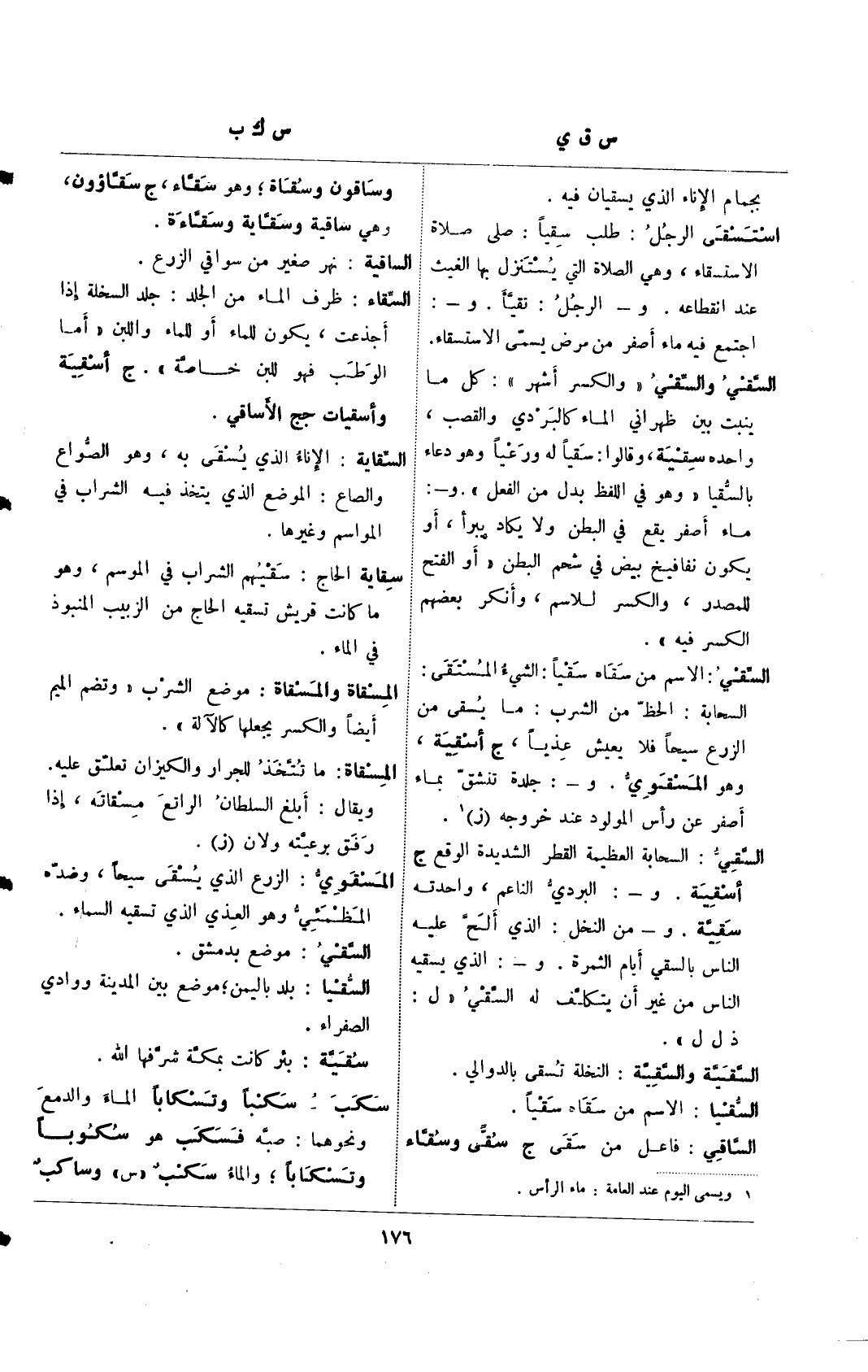 السقي والسقي: "والكسر أشهر": كل ما ينبت بين ظهراني الماء كالبردي والقصب، واحدة سقية، وقالوا: سقيا له ورعيا وهو دعاء بالسقيا "وهو في اللفظ بدل من الفعل" و–: ماء أصفر يقع في البطن ولا يكاد يبرأ، أو يكون نفافيخ بيض في شحم البطن، "أو الفتح للمصدر، والكسر للاسم، وأنكر بعضهم الكسر فيه".