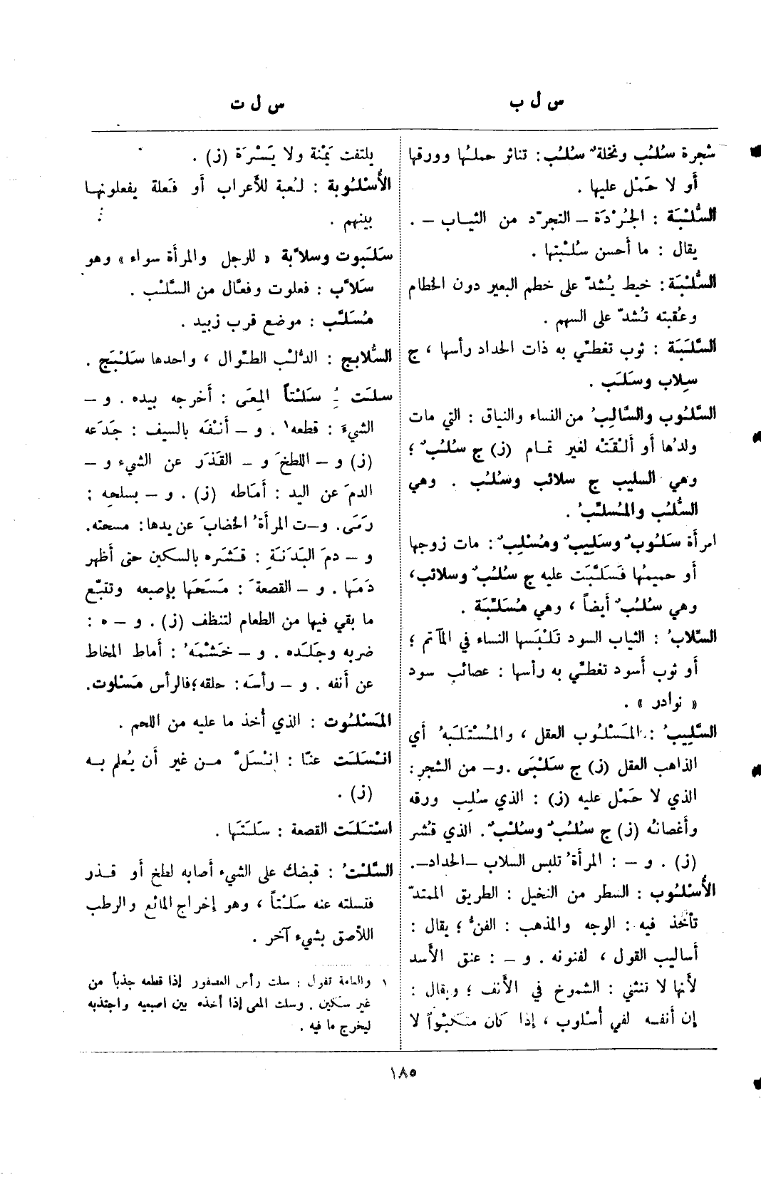 سلت- سلتًا المعى: أخرجه بيده. و- الشيء: قطعه (¬1).و- أنفه بالسيف: جدعه (ز) و- اللطخ و- القذر عن الشيء و- الدم عن اليد: أماطه (ز).و- بسلحه: رمى. و-ت المرأة الخضاب عن يدها: مسحته. و-دم البدنة: قشره بالسكين حتى أظهر دمها. و- القصعة: مسحها بإصبعه وتتبع ما بقي فيها من الطعام لتنظيف (ز).و-هـ: ضربه وجلده. و- خشمه: أماط المخاط عن أنفه. و- رأسه: حلقه؛ فالرأس مسلوت.