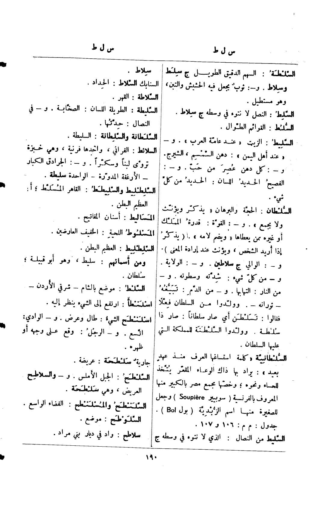 السلطان: الحجة والبرهان " يذكر ويؤنث ولا يجمع".و-: القوة: قدرة المملك أو غيره ممن يعطاها "ويضم لامه". (يذكر إذا أريد الشخص, ويؤنث عند إرادة المعنى).