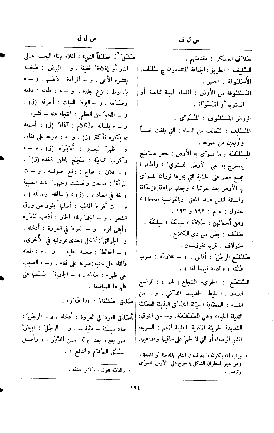أسلق العود في العورة: أدخله. و- الرجل: صاد سلقة- ذئبة-.و- الرجل: ابيض ظهر بعيره بعد برئه من الدبر. "وأل السلق الصدم والدفع".