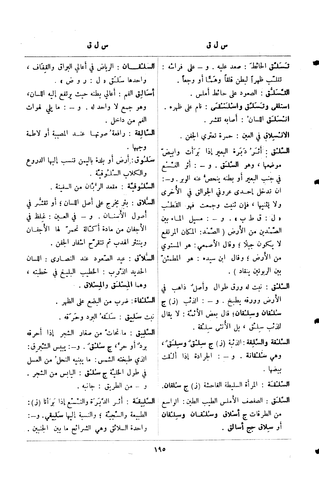السلق: أثر دبرة البعير إذا برأت وابيض موضعها, وهو السلق. و-: أثر النسع في جنب البعير أو بطنه ينحص عنه الوبر. و-: ان تدخل إحدى عروتي الجوالق في الأخرى ولا يثنيها, فإن ثنيت وجمعت فهو القطب "ل: ق ط ب".و-: مسيل الماء بين الصمدين من الأرض (الصمد: المكان المرتفع لا يكون جبلًا؛ وقال الأصمعي: هو المستوي من الأرض؛ وقال ابن سيده: هو المطمئن بين الربوتين ينقاد).