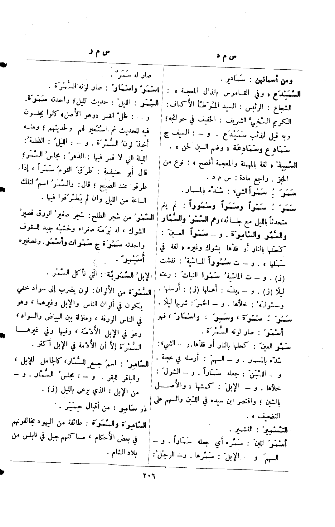 سمر– سمرًا وسمرًا وسمورًا: لم ينم متحدثًا بإلىل مع جلسائه، وهم السمر والسمار والسامرة. و- سمرً العين: كحلها بالنار أو فقأها بشوك وغيره "لغة في سلملها". و– ت سمورًا الماشية: نفشت (ز). و– إبله: أهلها (ز): أسلها. و– شوله: خلاها. و– الخمر: شربها ليلًا.