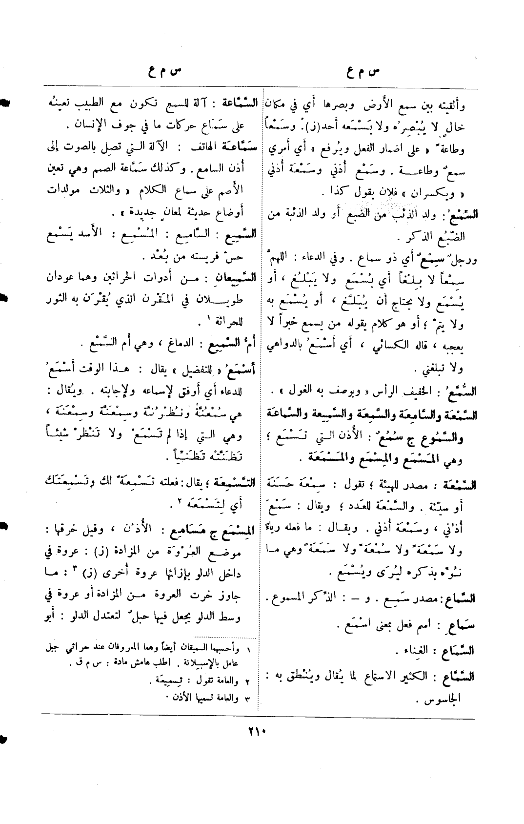 السماعة: آلة السمع تكون مع الطبيب تعينه على سماعة حركات ما في جوف الإنسان. سماعة الهاتف: الالة التي تصل بالصوت إلى أذن السامع. وكذلك سماعة الصمم وهي تعين الأصم على سماع الكلام "والثلاث مولدات أوضاع حديثة لمعانٍ جديدة".