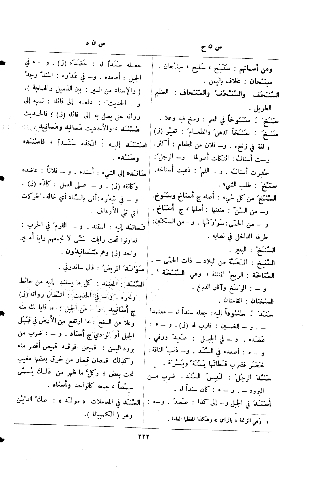 سند– سنودًا إلىه: جعله سندًا له– معتمدًا-.– للخمسين: قارب لها (ز). و– هـ: و– هـ: أصعده في السند. و– ذنب الناقة: خطر فضرب قطاتها يمنة ويسرة.