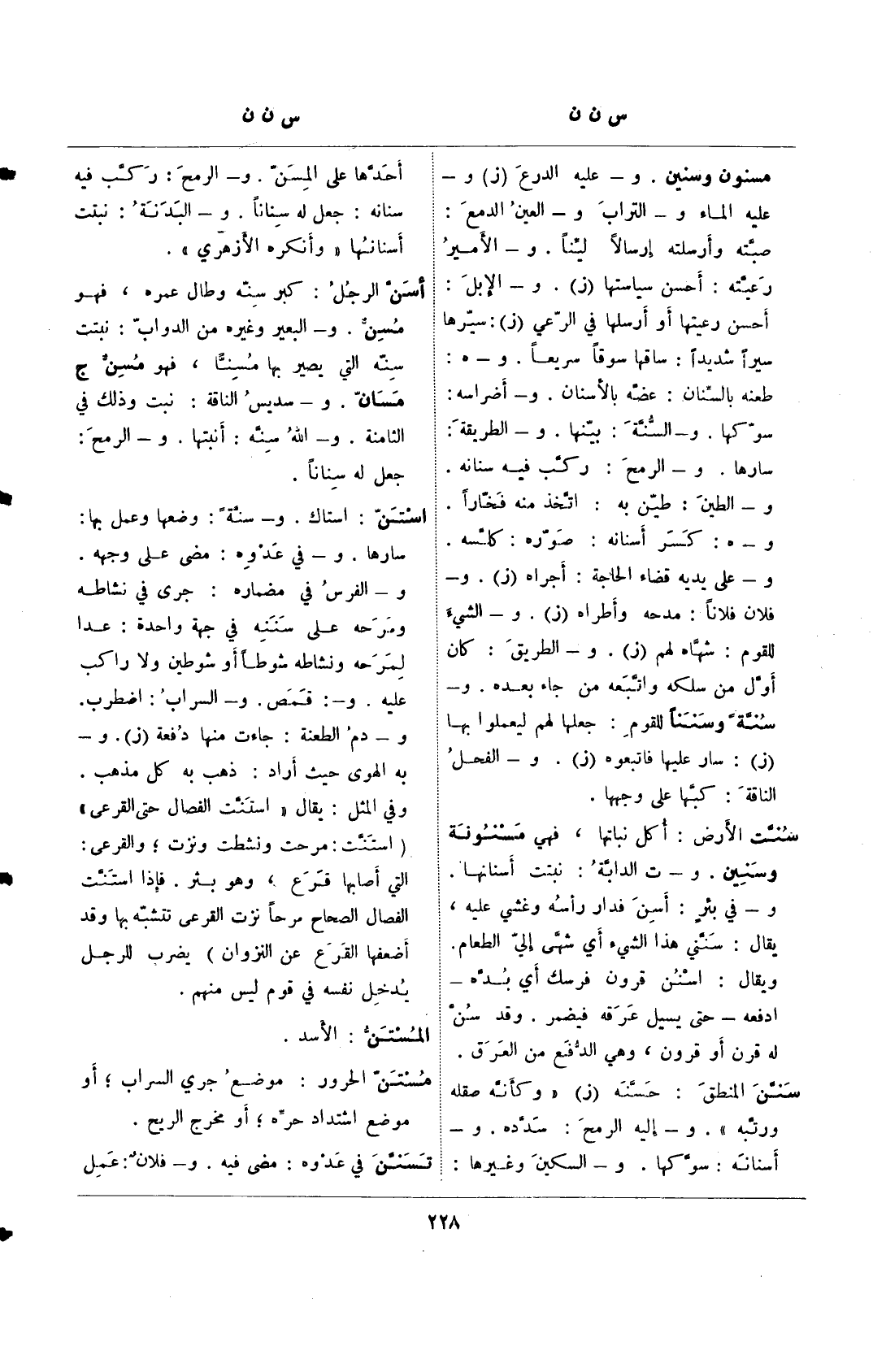 سنت الأرض: أكل نباتها، في مسنوفة وسنين. و– ت الدابة: نبتت أسنانه. و– في بئٍر: أسن فدار رأسه وغشي عليه، يقال: سنني هذا الشيء أي شهي إلى الطعام. ويقال: اسنن قرون فرسك أي بده– ادفعه– حتي يسيل عرقه فيضمر. وقد سن له قرن أو قرون، وهي الدفع من العرق.