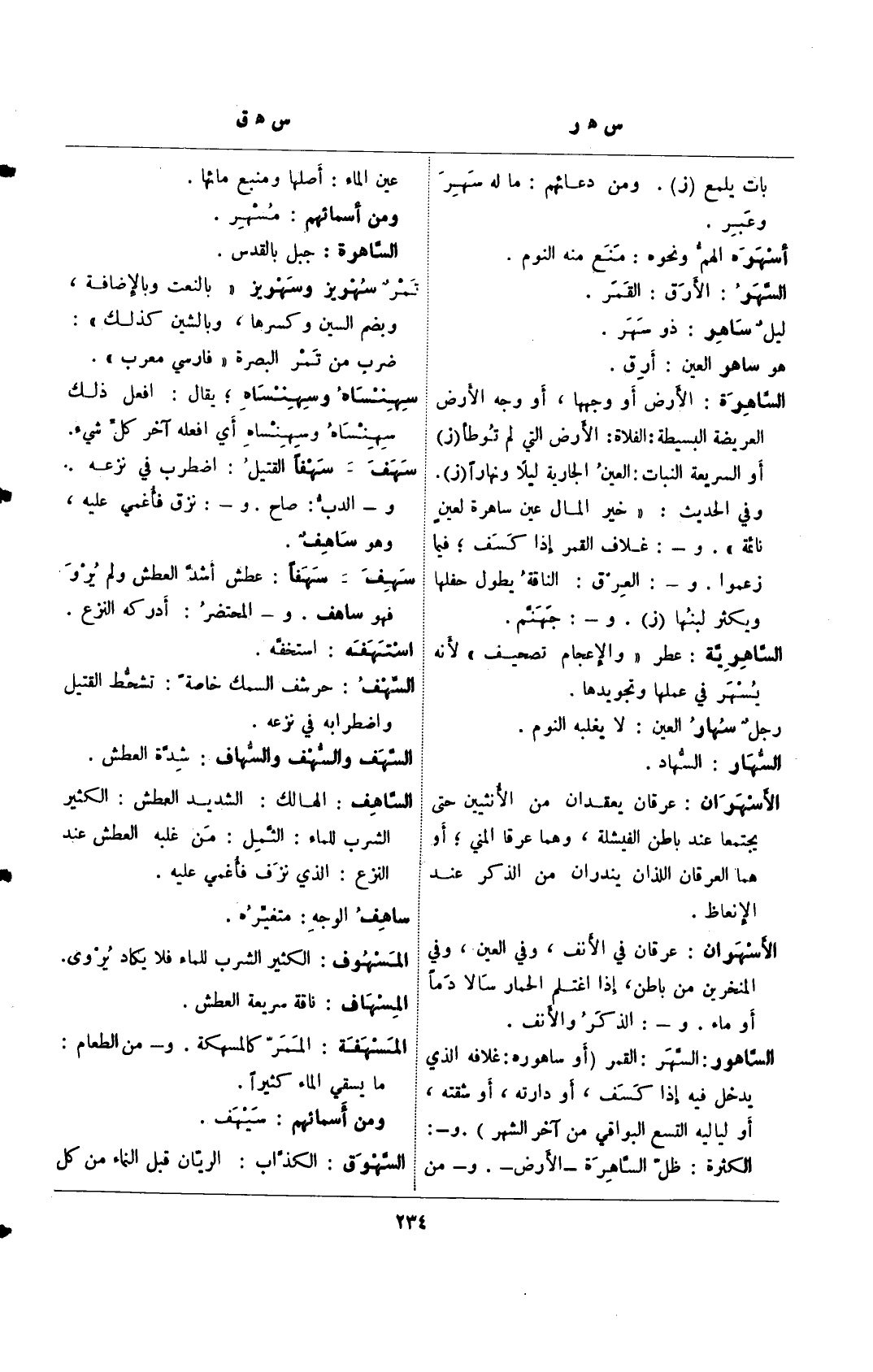 الساهرة: الأرض أو وجهها، أو وجه الأرض المريضة البسيطة: الفلاة: الأرض التي لم توطأ (ز) أو السريعة النبات: العين الجارية ليلًا ونهارًا (ز). وفي الحديث: "خير المال عين ساهرة لعيٍن نائمة". و-: غلاف القمر إذا كسف، فيما زعموا. و-: العرق: الناقة يطول حفلها ويكثر لبنها (ز). و-: جهنم.