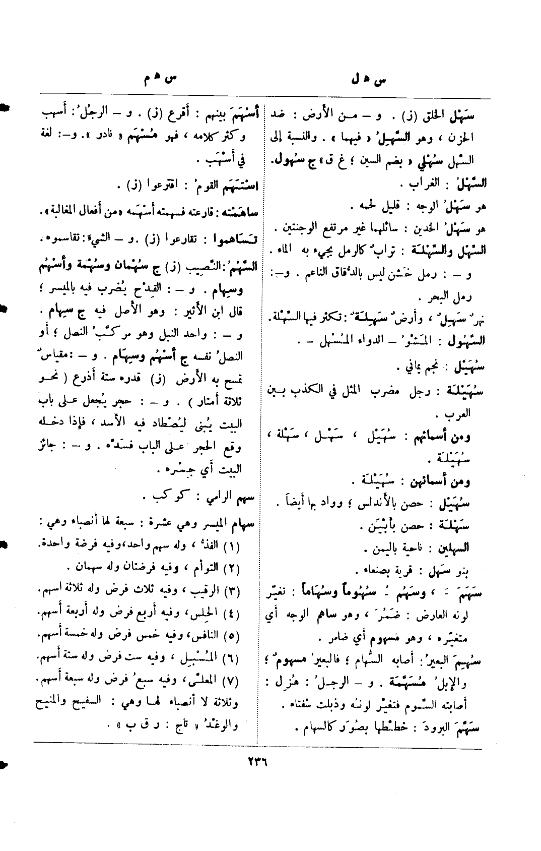 السهم: النصيب (ز).ج سهمان وسهمة وأسهم وسهام. و-: القدح يضرب فيه بالميسر، قال ابن الأثير: وهو الأصل فيه ح سهام و-: واحد النبل وهو مركب النصل، أو النصل نفسه ج أسهم وسهام. و– مقياس تمسح به الأرض (ز). قدره ستة أذرع (نحو ثلاثة أمتار).-: حجر يجعل علي باب البيت بيني ليصطاد فيه الأسد، فإذا دخله وقع الحجر علي الباب فسده. و-: جائز البيت أي جسره.
