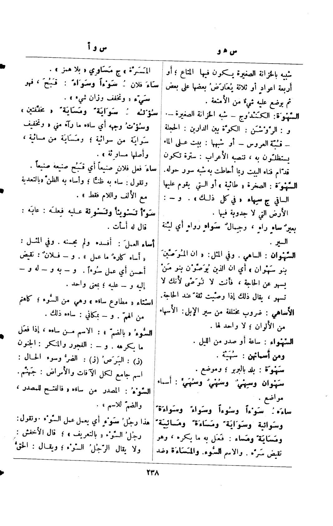 سان فلان– سواءًا وسواًء: قبح، فهو سةء "وتخفف وزان شيء ".سؤته– سواية ومسايًة "مخففتين" وسؤت وجهه أي ساءت ما رآه مني "تخفيف سواية من سوائية، ومساية من مسائية، وأصلها مساوئة".