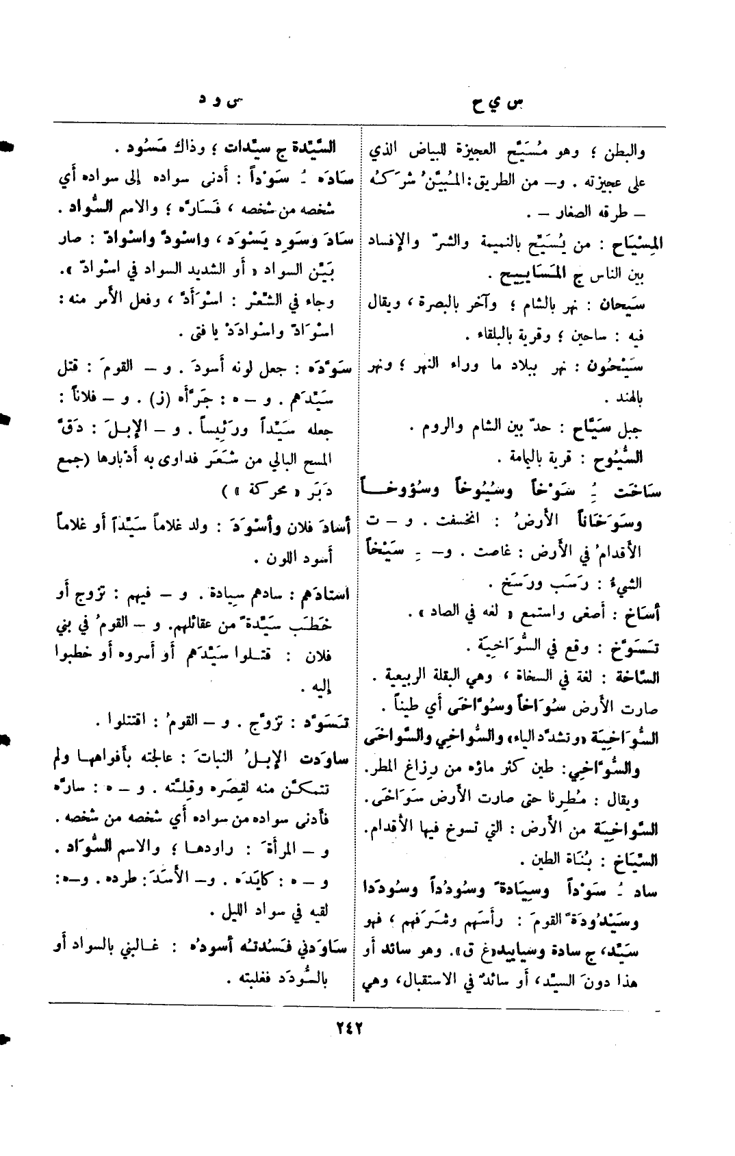 ساد– سوادًا وسيادة وسددا وسيدوة القوم: رأسهم وشرفهم، فهو سيد، ج سادة وسياييد "غ ق". وهو سائد أو هذا دون السيد، أو سائد في الاستقبال، وهي