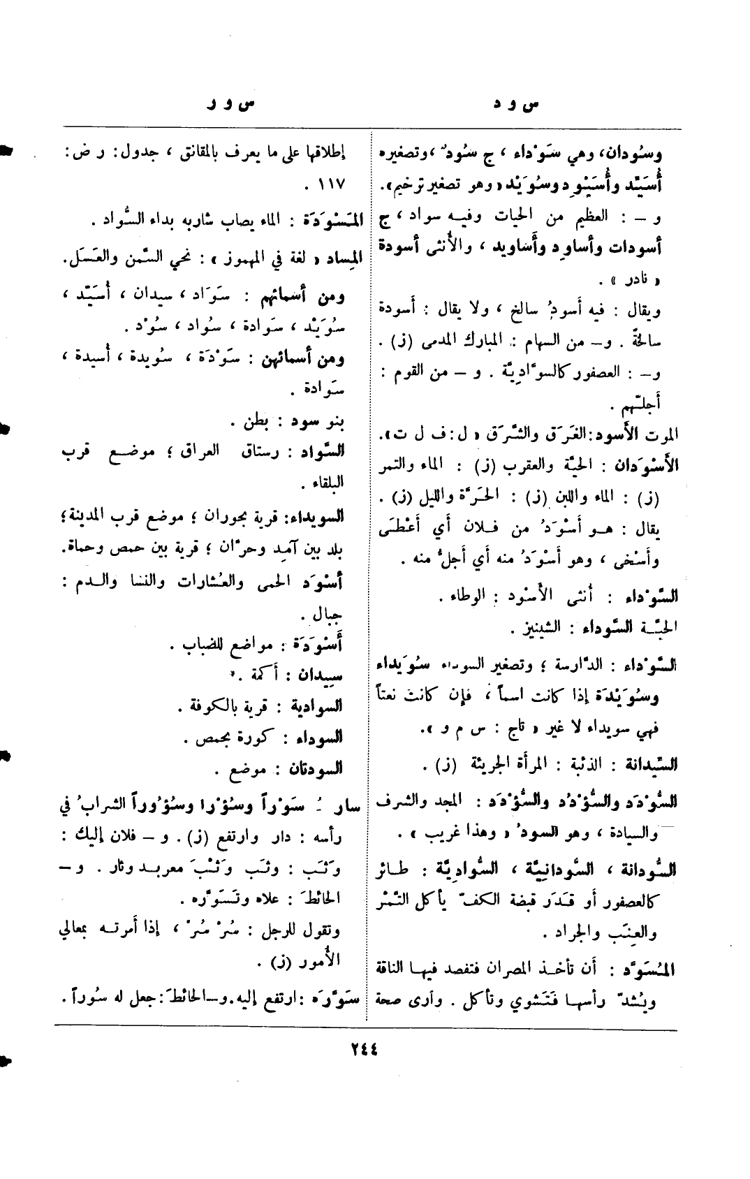 وسودان، وهي سوداء، ج سود، وتصغيره أسيد وأسيود وسويد "وهو تصغير ترخيم".