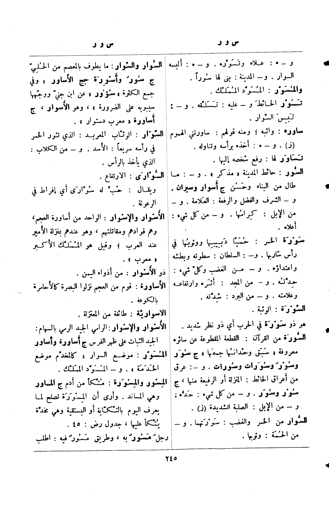 الأسوار والإسوار: الرمي الجيد الرمي بالسهام: الجيد الثياب على ظهر الفرس ج أساورة وأساور المسور: موضع السور "كالمخدم موضع الخدمة". و– المسود المملك.