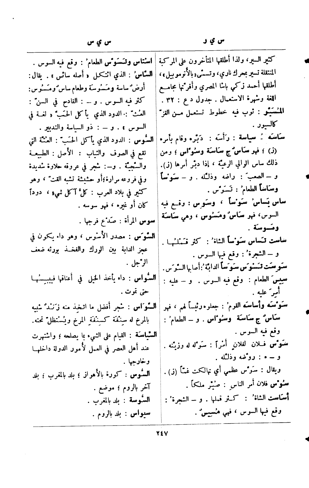 ساسه– سياية: رأسه: دبره وقام بأمره (ز) , فهو ساس ج ساسة وسواس، ومن ذلك ساس الوإلى الرعية، إذا دبر أمرها (ز). و– الصعب: راضه وذلله. و– سوسًا وساسًا الطعام: تسوس.