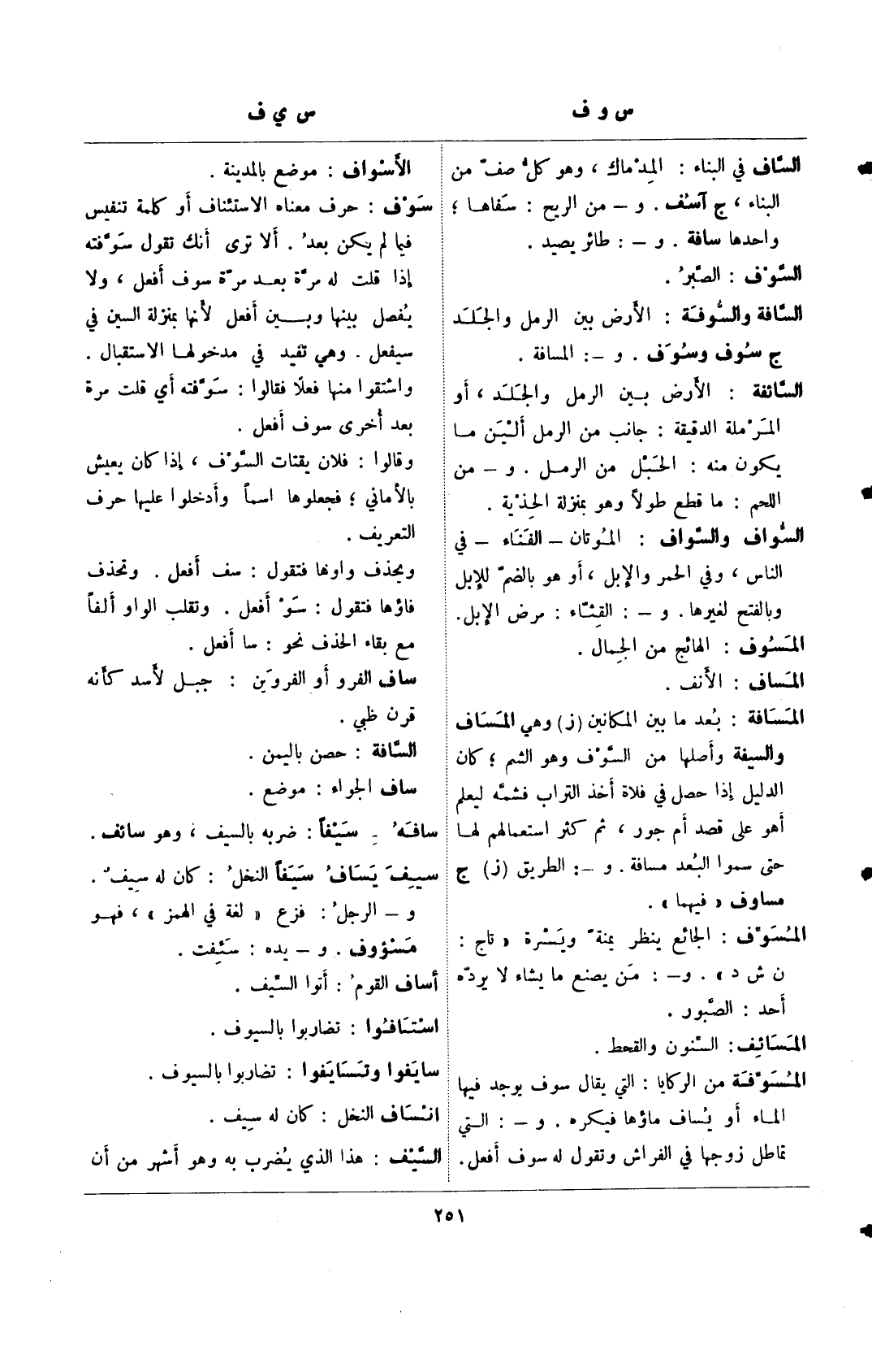 المسوفة من الركايا: التي يقال سوف يوجد فيها الماء او يساف ماؤها فيكره. و-: التي تماطل زوجها في وتقول له سوف أفعل.
