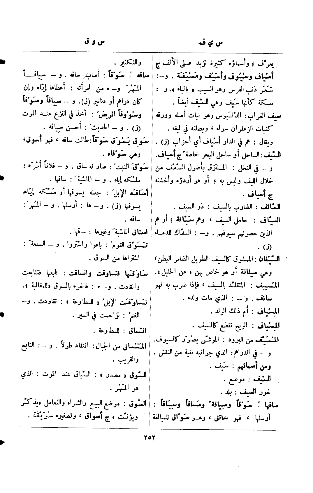 ساقه– سوقًا: أصاب ساقه. و– سياقًا المهر و– هـ من امرأته: أعطاها إياه وإن كان دراهم أو دنانير (ز). و– سياقًا وسوقًا وسووقًا المريض: أخذ في النزع عند الموت (ز). و– الحديث: أحسن سياقه.