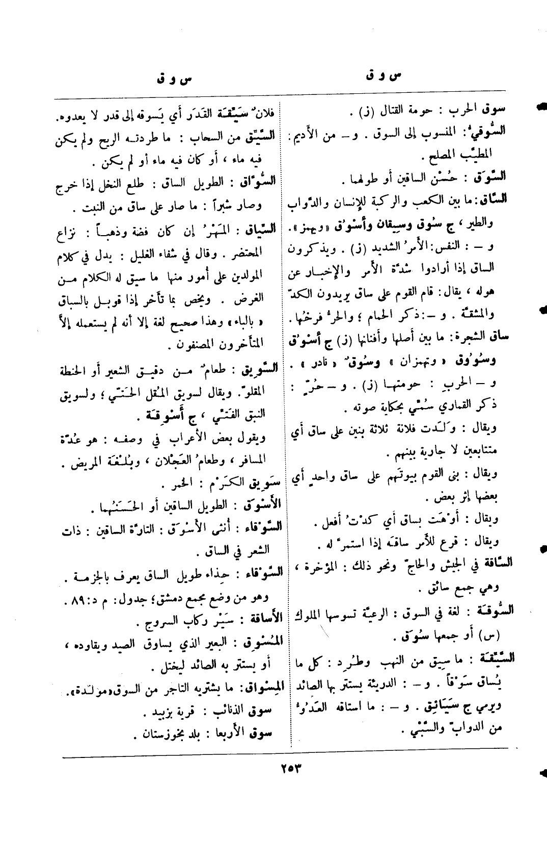 الساق: ما بين الكعب والركبة للإنسان والدواب والطير، ج سوق وسيقان وأسواق "ويهمز". و-: النفس: الأمر الشديد (ز). ويذكرون الساق إذا أرادوا شدة الأمر والإخبار عن هوله، يقال: قام القوم علي ساق يريدون الكد والمشقة. و– ذكر الحمام، والحر فرخها. ساق الشجرة: ما بين أصلها وأفنانها (ز) ج أسواق وسووق "تهمزان" وسوق "نادر". و– الحرب: حومتها (ز). و– حٍر ذكر القماري سمي بحكاية صونه.