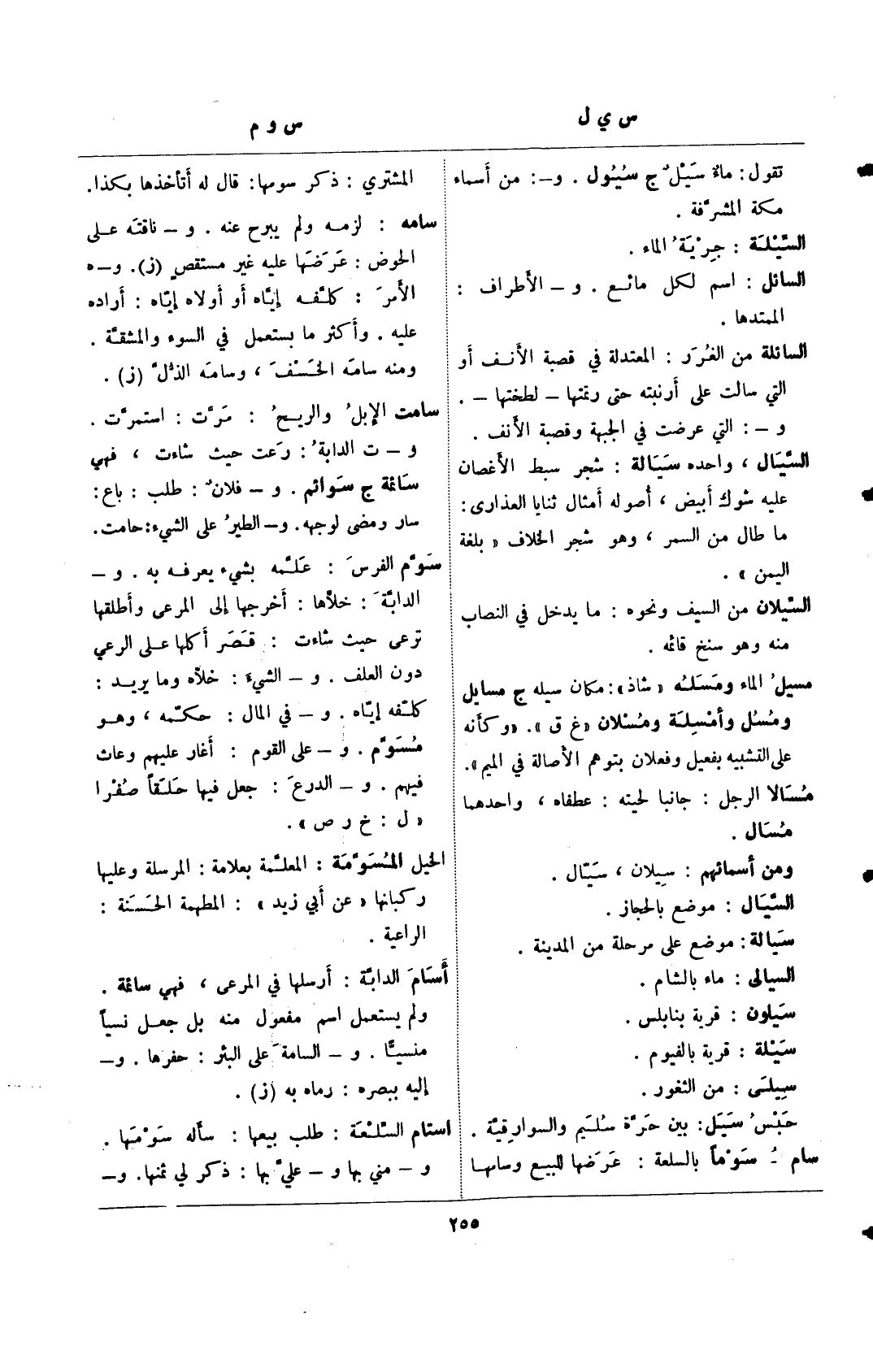 مسيل الماء ومسله "شاذ": مكان سيله ج مسايل ومسل وأمسلة ومسلان "غ ق". "وكأنه على التشبيه بفعيل وفعلان بتوهم الأصالة في الميم".
