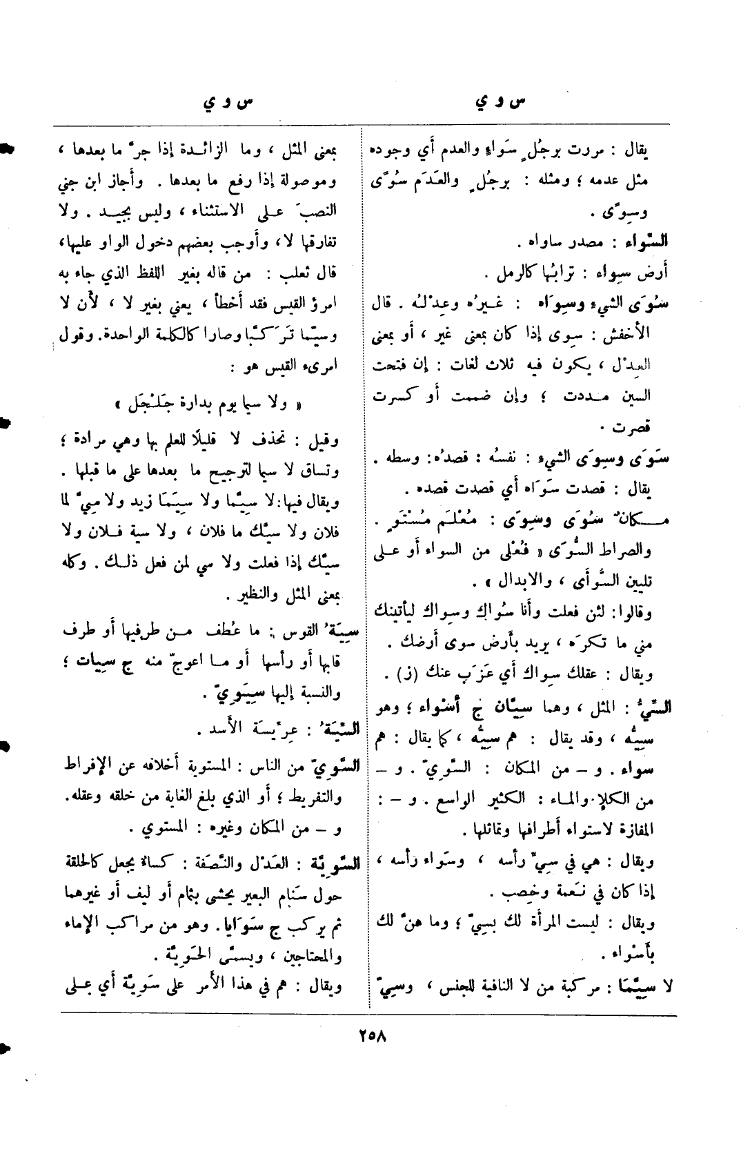 السي: المثل، وهما سيان ج أسواء، وهو سيه، وقد يقال: هم سيه، كما يقال: هم سواء. و– من المكان: السوي. و– من الكلا والماء: الكثيرة الواسع. و-: المفازة لاستواء أطرفها وتماثلها.