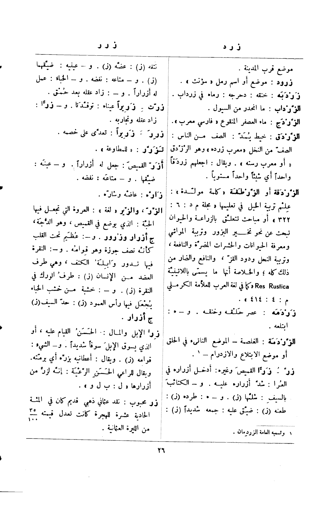 زر – زرا القميص وغيره: أدخل أزراره في العرا: شد أزراره عليه. و – الكتائب بالسيف: شلمها (ز). و – هـ: طرده (ز): طعنه (ز): ضيق عليه: جمعه شديدًا (ز): نتفه (ز): عضه (ز). و – عينيه: ضيقهما (ز). و – متاعه: نفضه. و – الخباء: عمل له أزرارًا. و -: زاد عقله بعد حمق. زرت – زريرًا عيناه: توقدتا. و – زرًا: زاد عقله وتجاربه.