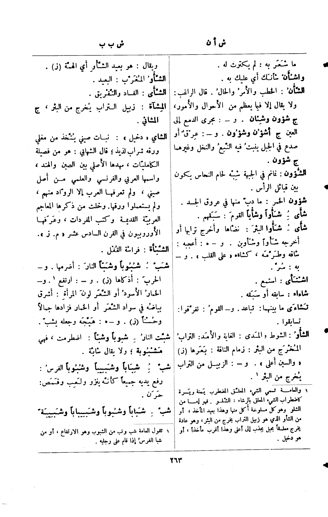 شأى– شأوآ البئر: نضاها وأخرج ترابها أو أخرجه شأوآ وشأوين. و- هـ: أعجبه: شاقه وطرمة، كشاءة "على القلب". و– به: سر.