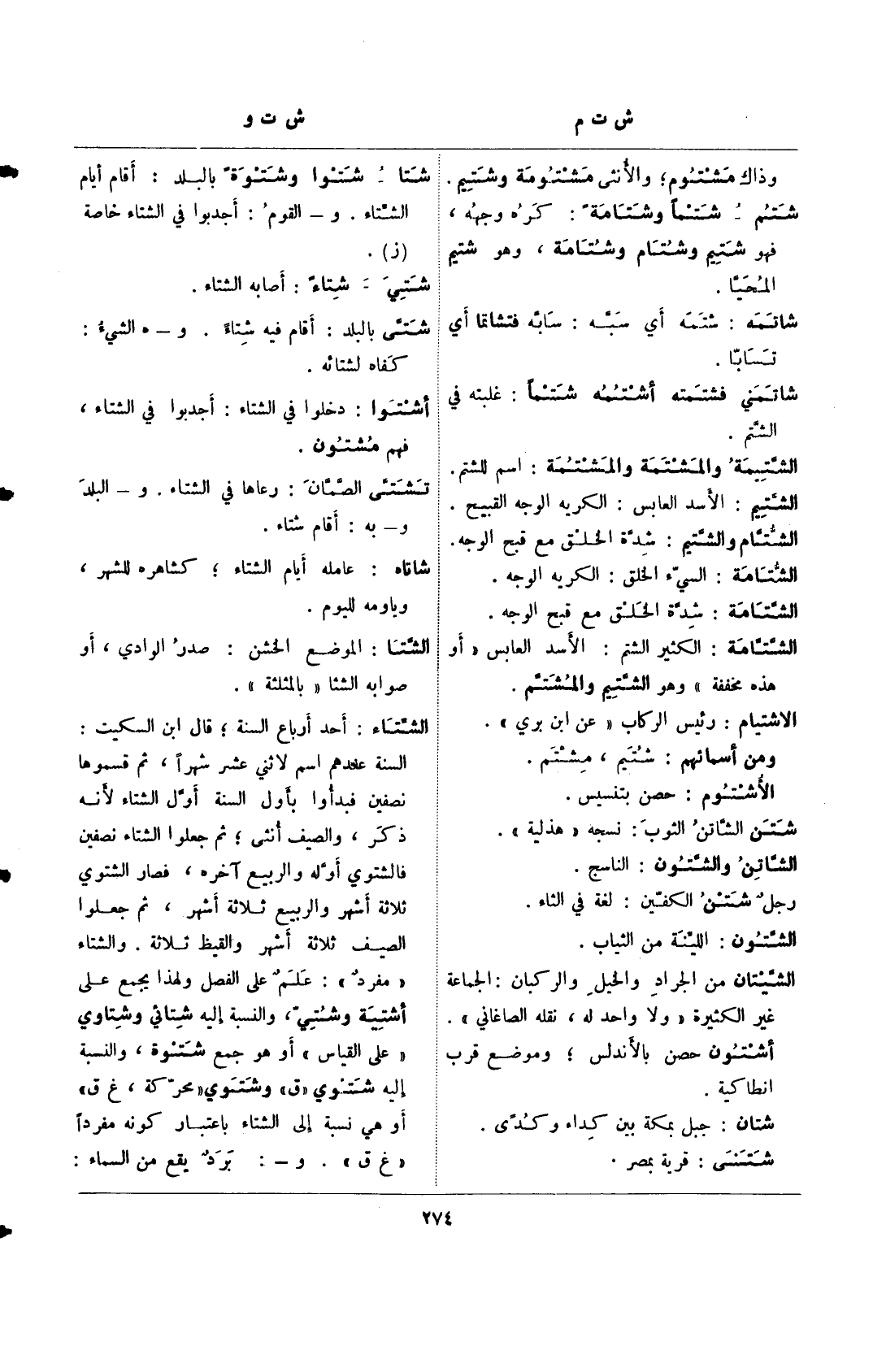 والشتاء "مفرد": علم على الفصل ولهذا يجمع على أشتية وشتي، والنسبة إلىه شتائي وشتاوي "على القياس" أو هو جمع شتوة، والنسبة إلىه شتوي "ق" وشتوي "محركة، غ ق" أو هي نسبة إلى الشتاء باعتبار كونه مفردًا "غ ق ". و-: برد يقع من السماء: