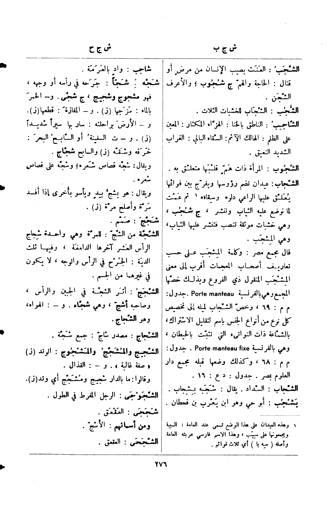قال مجمع مصر: وكلمة المشجب على حسب تعاريف أصحاب المعجمات اقرب إلى معنى المشجب المنقول ذي الفروع وبذلك خصها المجمع وهي بالفرنسية porte manteau. جدول: م م: 69، وخص الشجاب لميله إلى تخصيص كل نوع من أنواع الجنس باسم لتقليل الاشتراك، بالشماعة ذات النواتئ التي تثبت بالحيطان، وهي بالفرنسية porte manteau fixe. جدول م م: 68، وكذلك وضعها قبله مجمع دار العلوم بمصر. جدول: د ع: 16.