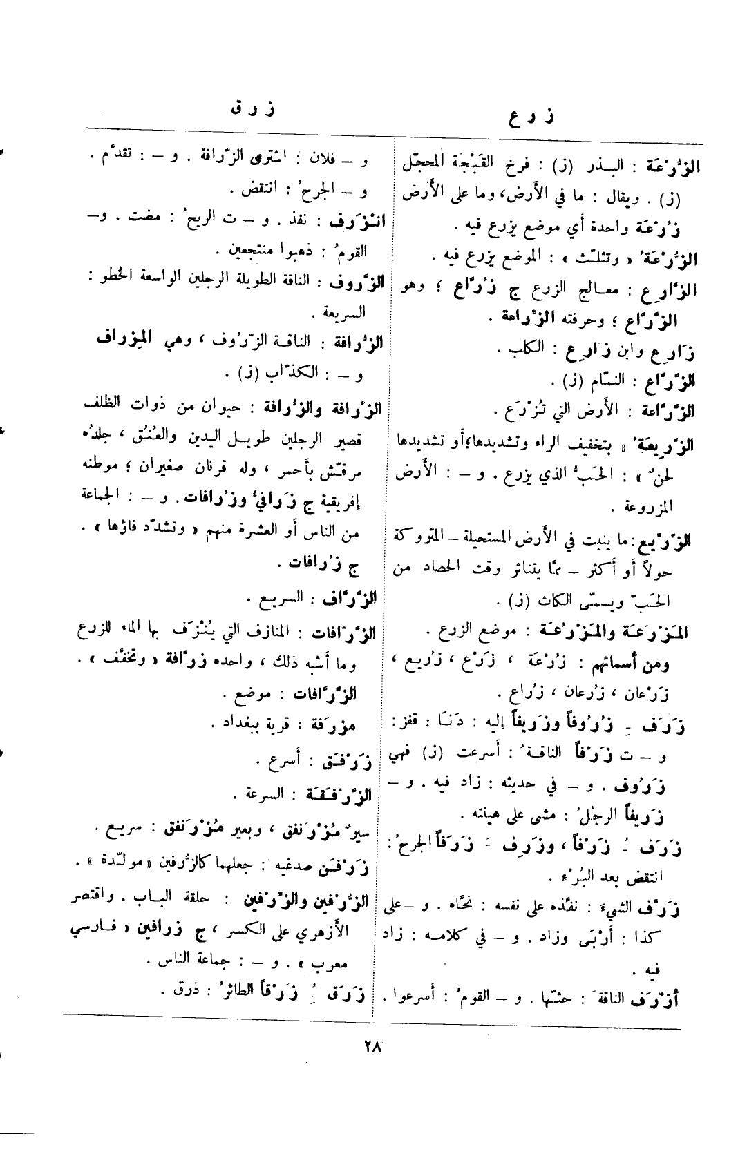 الزرافة: الناقة الزروف، وهي المزراف و -: الكذاب (ز).