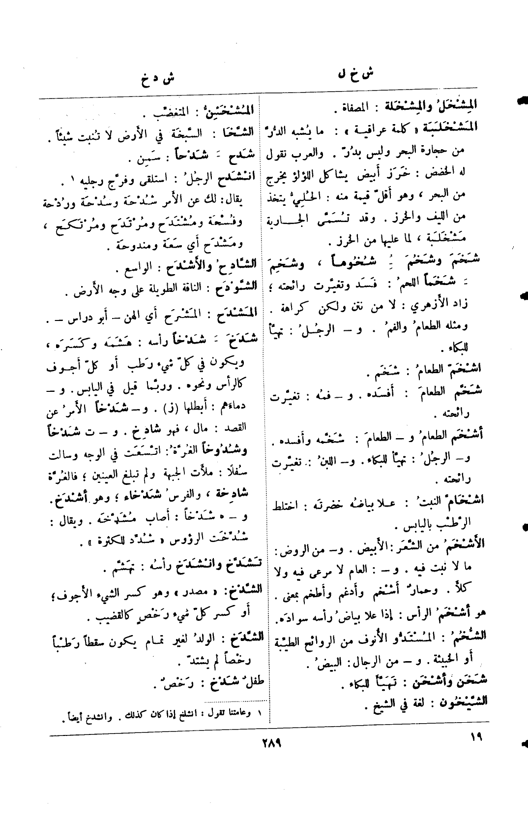 شدخ– شدخًا رأسه: هشمه وكسره، ويكون في كل شيء رطب أو كل أجوف كالرؤس ونحوه. وربما قيل في إلىبس. و- دماءهم: أبطلها (ز). و- شدخًا الأمر عن القصد: مال، فهو شادخ. و-ت شدخًا وشدوخًا الغرة: اتسعت في الوجه وسالت سفلًا: ملأت الجبهة ولم تبلغ العينين، فالغرة شادخة، والفرس شدخاء، وهو أشدخ.