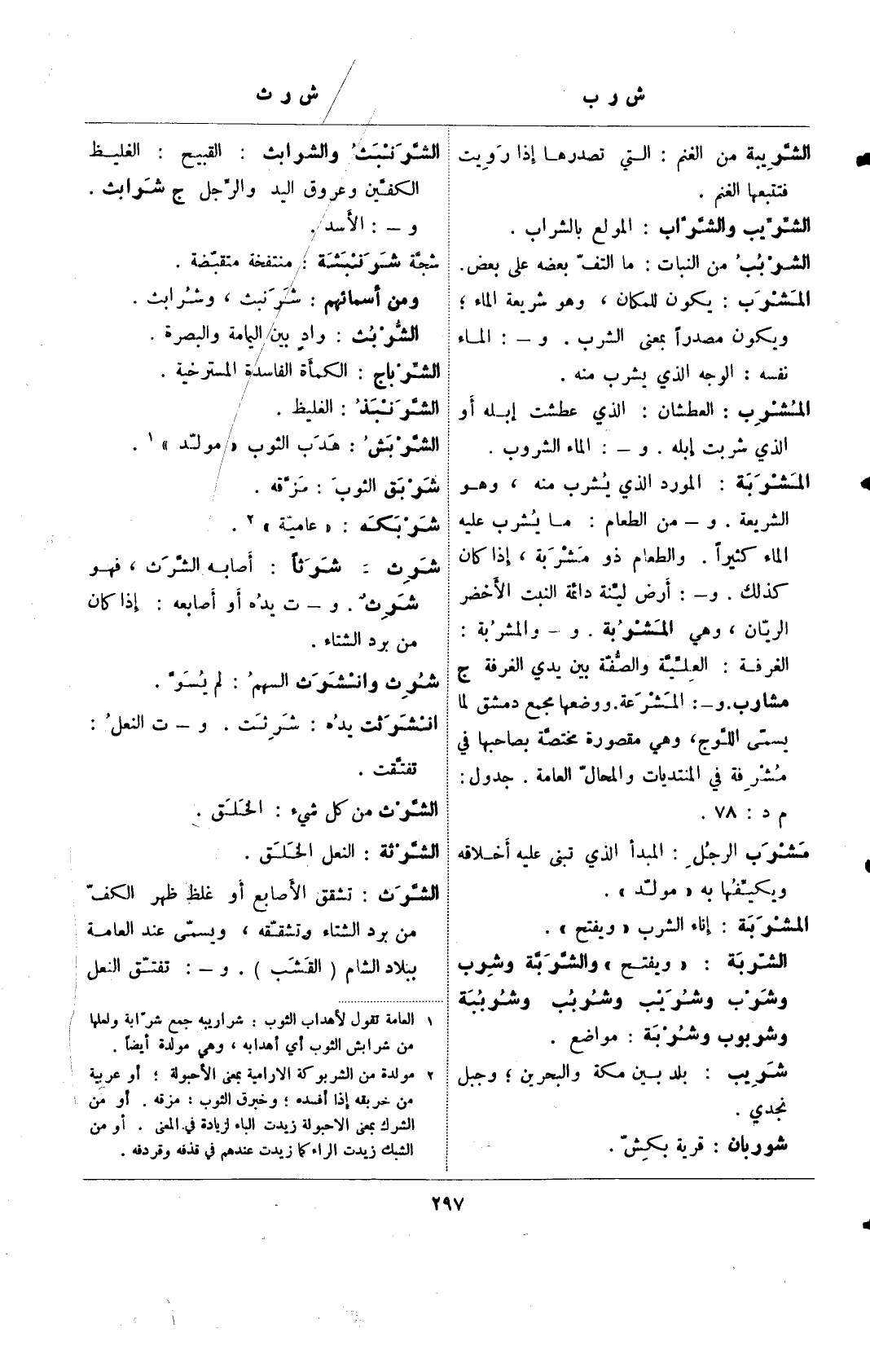 المشرب: يكون للمكان، وهو شريعة الماء، ويكون مصدرًا بمعنى الشرب. و-: الماء نفسه: الوجه الذي يشرب منه.
