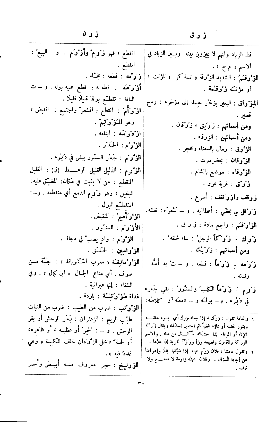 الزرنب: ضرب من الطيب: ضرب من النبات طيب الريح: الزعفران: بعر الوحش أو بقر الوحش. و -: الحر أو عظيمه، أو ظاهره، أو لحمةٌ داخل الزردان خلف الكينة "وهي غددٌ فيه".