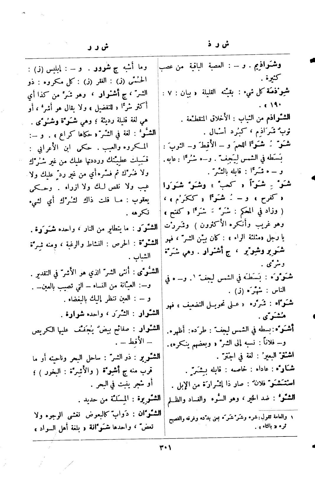 وما أشبه ج شرور. و-: إبليس (ز): الحُمّى (ز): الفقر (ز): كل مكروه: ذو الشر، ج أشرار، وهو شر من كذا أي كثر شرًا "للتفضيل" ولا يقال هو أشر، أو هي لغة قليلة رديئة؛ وهي شرة وشرى.