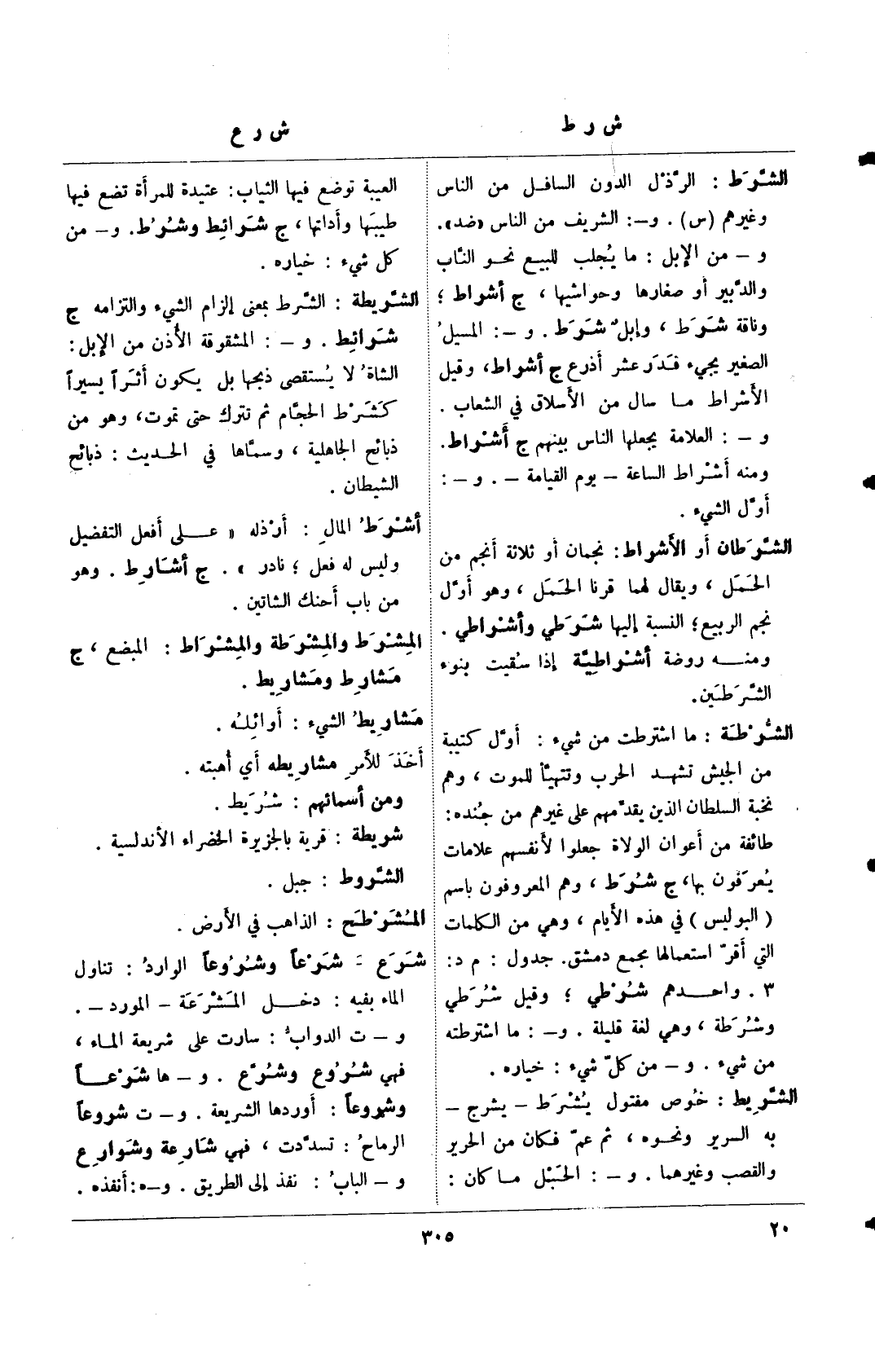 الشرط: الرذل الدون السافل من الناس وغيرهم (س). و-: الشريف من الناس "ضد". و- من الإبل: ما يُجلب للبيع نحو النّاب والدبير أو صغارها وحواشيها، ج أشواط؛ وناقة شرط، وإبل شرط. و-: المسيل الصغيرة يجيء فدر عشر أذرع ج أشراط، وقيل الأشراط ما سال من الأسلاق في الشعاب. و-: العلامة يجعلها الناس بينهم ج أشراط. ومنه أشراط الساعة- يوم القيامة-. و-: أول الشيء.