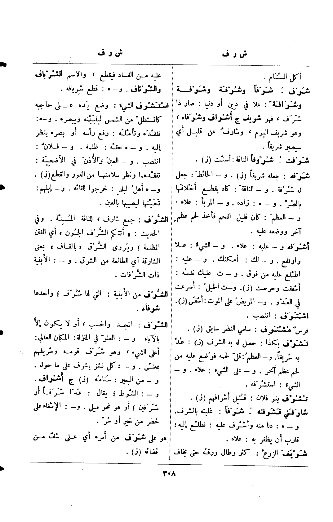 شرف- شرفًا وشرفة وشرفة وشرافة: علا في دين أو دنيا: صار ذا شرف، فهو شريف ج أشراف وشرفاء، وهو شريف اليوم، وشارفٌ عن قليل أي سيصير شريفًا.