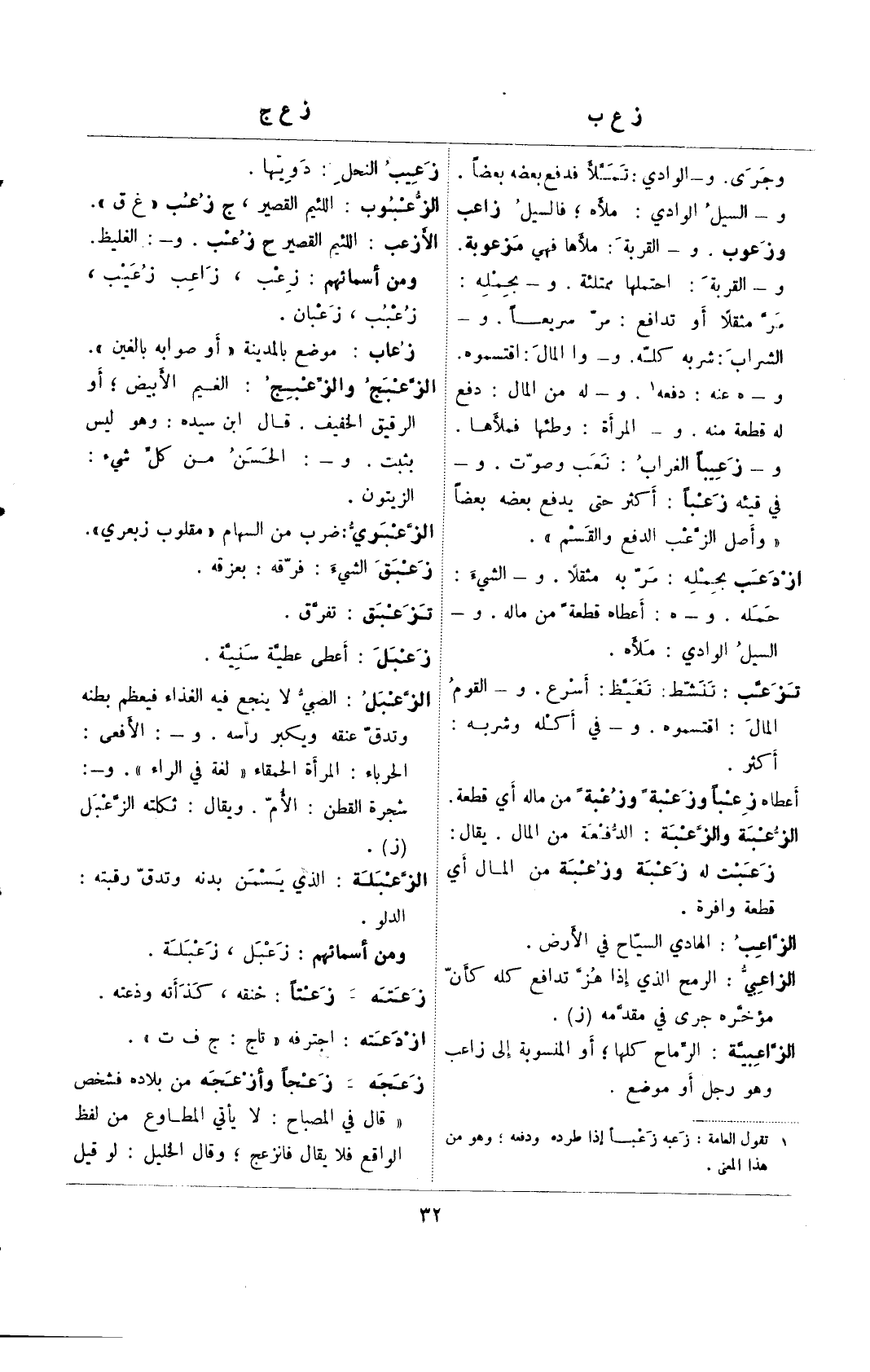 وجرى. و- الوادي: تملأ فدفع بعضه بعضاً. و- السيل الوادي: ملأه؛ فالسيل زاعب وزعوب. و- القربة: ملأها فهي مزعوبة. و- القربة: احتملها ممتلئة. و- بحمله: مر مثقلاً أو تدافع: مر سريعاً. و- الشراب: شربه كله. و- والمال: اقتسموه. و- هـ عنه: دفعه (¬1). و- له من المال: دفع له قطعة منه. و- المرأة: وطئها فملأها. و- زعيباً الغراب: نعب وصوت. و- في قيئه زعباً: أكثر حتى يدفع بعضه بعضاً "وأصل الزعب الدفع والقسم".