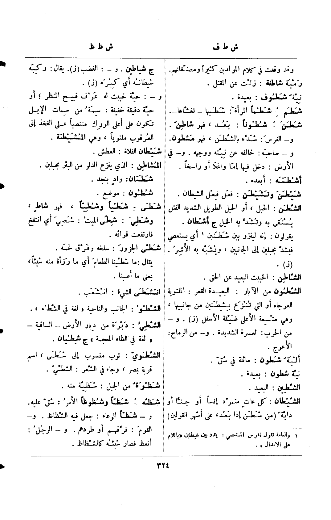 الشّطُون من الآبار: البعيدة القعر: الملتوية العوجاء أو التي تُنْزَع بِشِطْنين من جانبيها، وهي متّسعة الأعلى ضيقة الأسفل (ز). و- من الحرب: العسرة الشديدة. و- من الرماح: الأعوج.