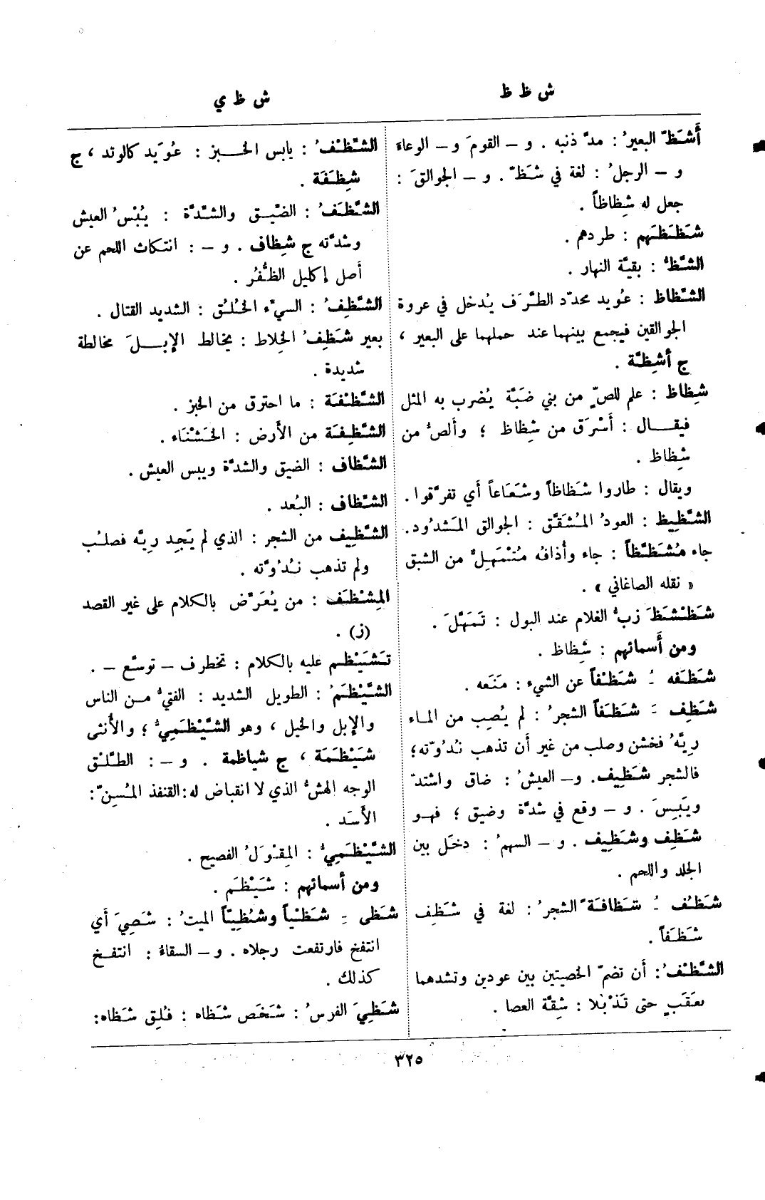 شَظِف- شظفًا الشجر: لم يُصِب من الماء رِيَّه فخشن وصلب من غير أن تذهب نُدُوّته؛ فالشجر شظيف. و- العيش: ضاق واشتد ويبس. و- وقع في شدة وضيق؛ فهو شَظِف وشَظيف. و- السهم: دخل بين الجلد واللحم.