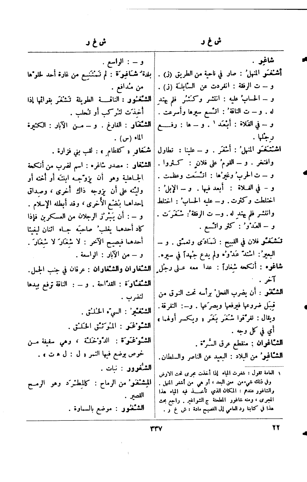 (¬1) العامة تقول: شغرت المياه إذا أخذت مجرى تحت الأرض وفي ذلك شيء من معنى البعد، أو هي من أشغر المنهل. والشاغور عندهم: المكان الذي تأخذ فيه المياه هذا المجرى، ومنه شاغور المطحنة ج الشواغير. راجع بحث هذا في كتابنا رد العامي إلى الفصيح مادة: ش غ ر.
