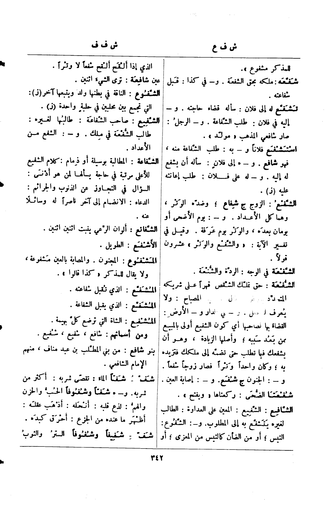 الشافع: الشفيع: المعين على العداوة: الطالب لغيره يتشفع به إلى المطلوب. و- الشفوع: التيس؛ أو من الضأن كالتيس من المعزى؛ أو