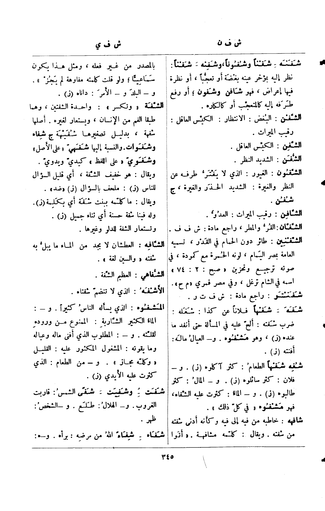 شفنه- شفنًا وشفونًا، وشفنه- شفنًا: نظر إليه بمؤخر عينه بغضة أو تعجبًا، أو نظرة فيها إعراض، فهو شافن وشفون؛ أو رفع طرفه إليه كالمتعجب أو كالكاره.