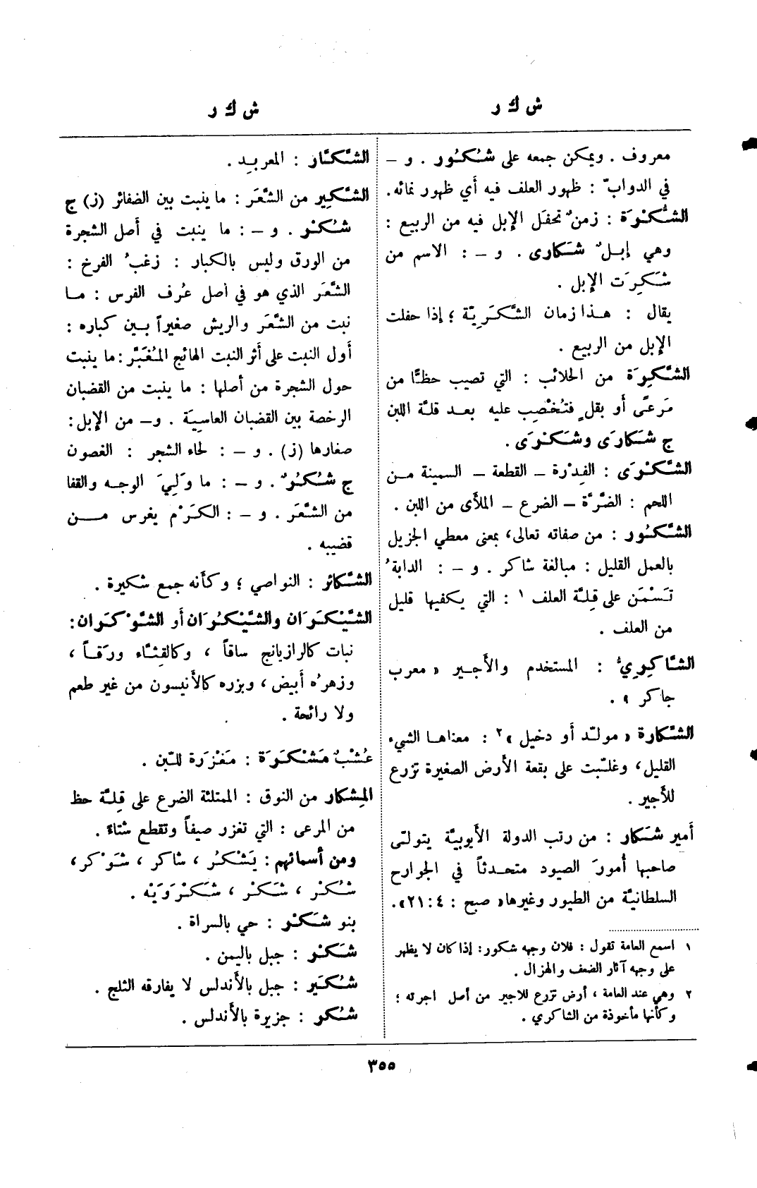 الشكور: من صفاته تعالى، بمعنى معطي الجزيل بالعمل القليل: مبالغة شاكر. و-: الدابة تسمن على قلة العلف (¬1): التي يكفيها قليل من العلف.