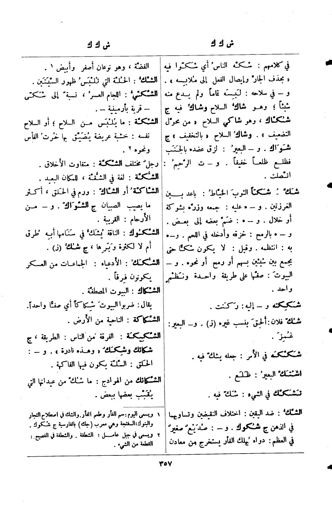 شك: شكاً الثوب الخياط: باعد بين الغرزتين. و-هـ عليه: جمعه وزره بشوكة أو خلال. و- هـ: ضم بعضه إلى بعض. و-هـ بالرمح: خزقه وأدخله في اللحم. و-هـ به: انتظمه. وقيل: لا يكون شكا حتى يجمع بين شيئين بسهم أو رمح أو نحوه. و- البيوت: صفها على طريقه واحدة ونظم واحد.