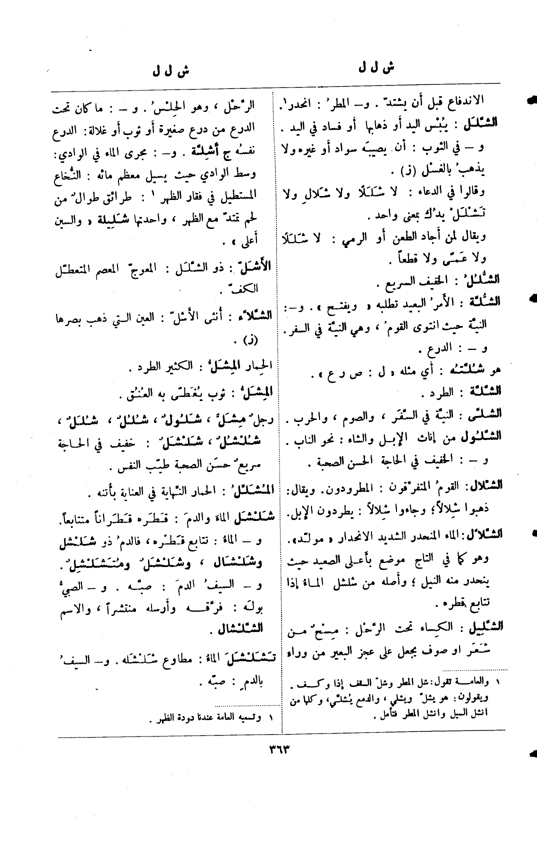 (¬1) والعامة تقول: شل المطر وشل السقف إذا وكف. ويقولون: هو يشل ويشلي، والدمع يشلي، وكلها من انشل السيل وانشل المطر فتأمل.
